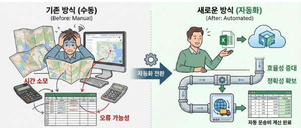 출발지와 도착지가 엑셀에 있고, 거리를 계산해 운송비를 산정한다는 흐름은 원래부터 존재했습니다. 다만 그 사이를 사람이 하나하나 연결하고 있었을 뿐입니다.