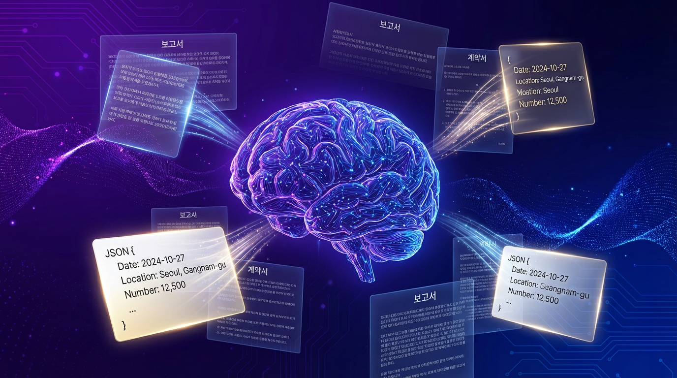 STEP 03 — GPT-4o Structured Output 추출된 날것의 텍스트를 GPT-4o에게 넘기며 한 가지 지시를 내립니다. "날짜, 시간, 장소, 참가자 수만 추출해서 정형화된 형식으로 돌려줘." Structured Output 기능을 통해 정확히 필요한 데이터만 JSON으로 반환됩니다.